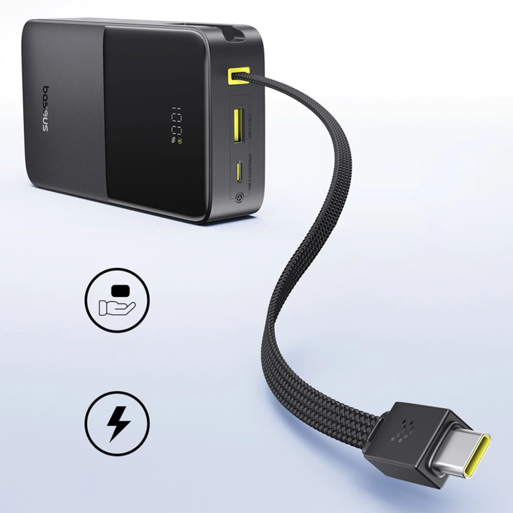 A Baseus EnerFill Bipow2 Pro egy strapabíró, fonott USB-C kábellel rendelkezik, amely diszkréten beépül a power bank házába. Nincs többé kábelszüret vagy összegabalyodás a táskában – csak vedd elő, csatlakoztasd, és már töltheted is USB-C kompatibilis eszközeidet. A 22 cm-es kábelhossz optimális használatot biztosít, és a kábel a power bank töltésére is alkalmas.
