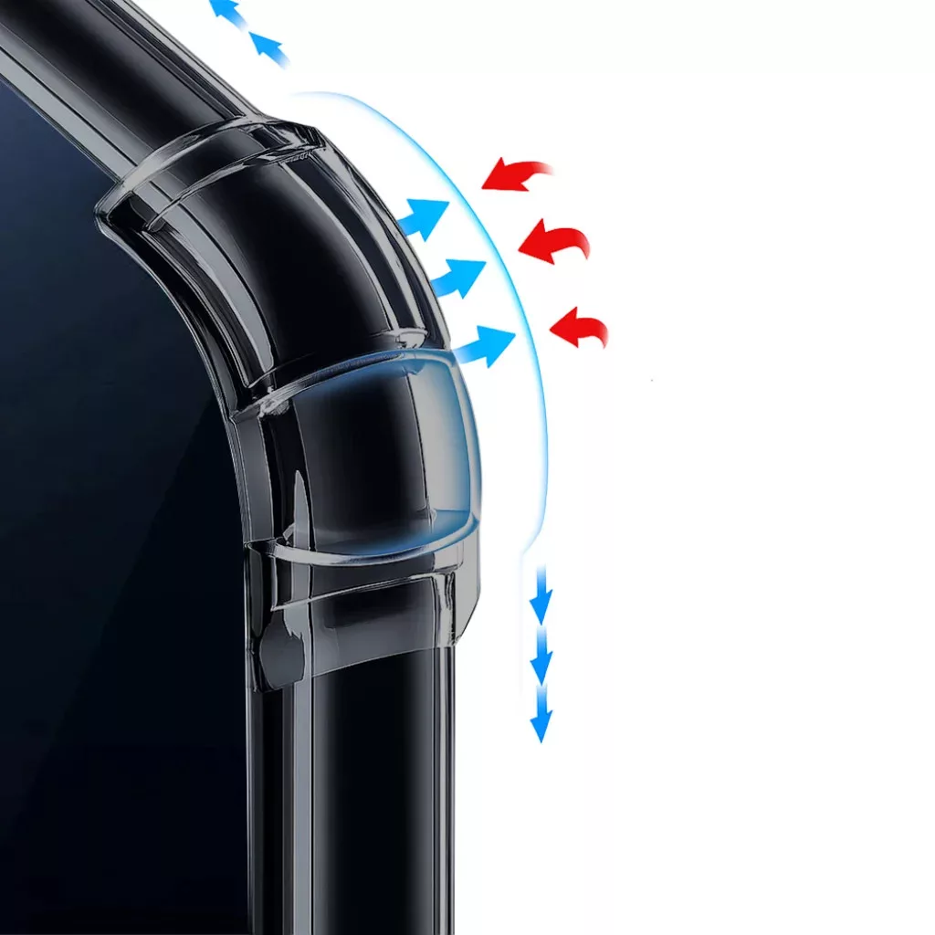 • A megerősített sarkokban található speciális légpárnás technológia (airbags) hatékonyan elnyeli az ütéseket és rázkódásokat, jelentősen csökkentve a telefon sérülésének kockázatát esés esetén.
