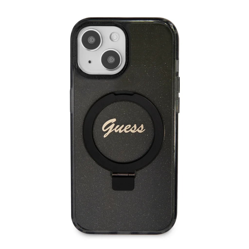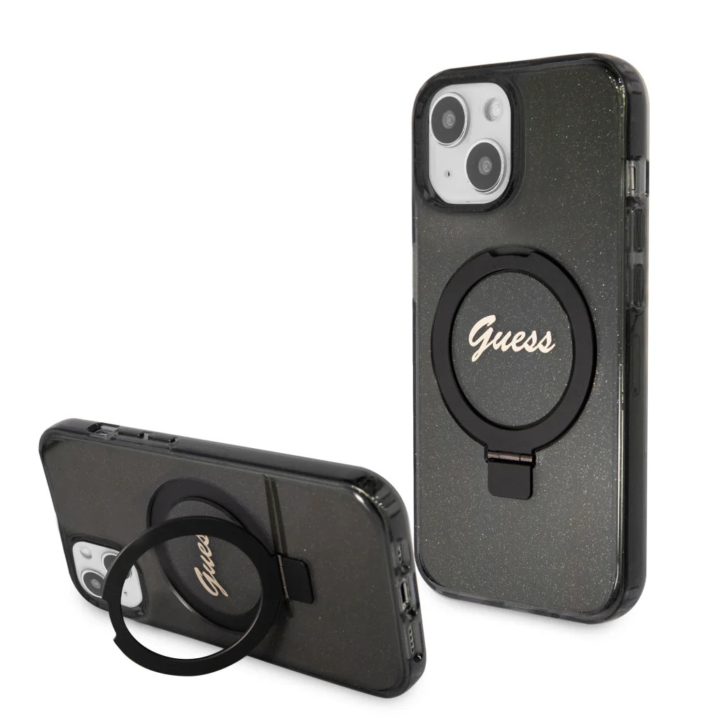 Guess IML Ring Stand Glitter MagSafe tok iPhone 15 Fekete