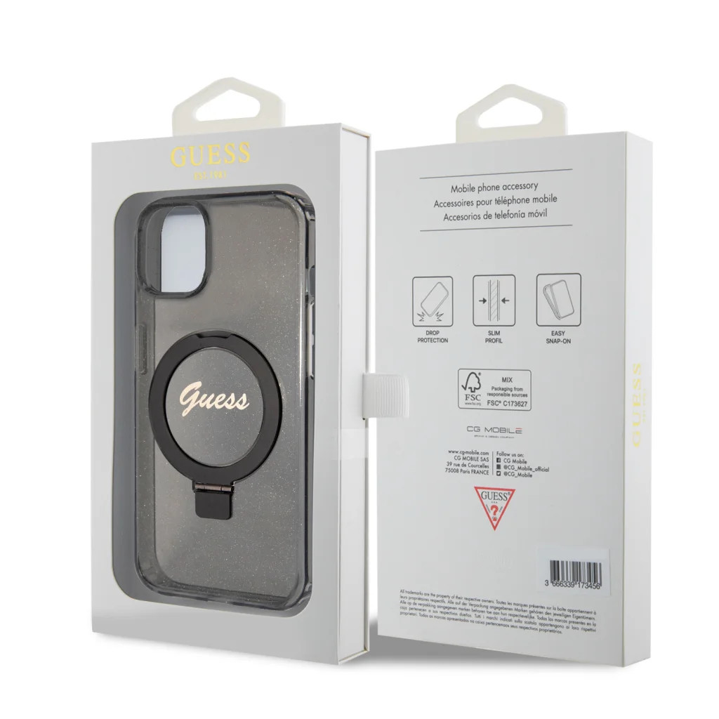 Guess IML Ring Stand Glitter MagSafe tok iPhone 15 Fekete-3666339156329 6 kép