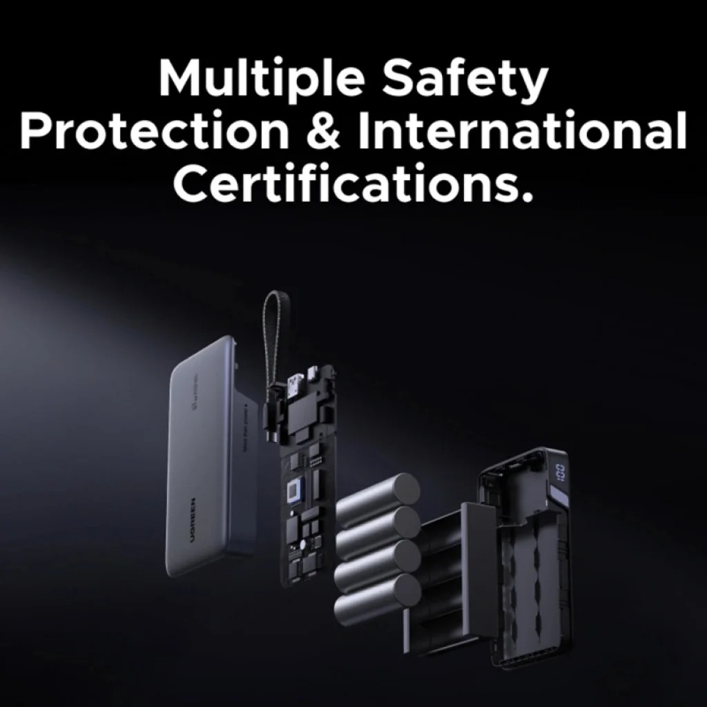 Az UGREEN PB550 nem csak gyors, hanem biztonságos is. Számos beépített biztonsági védelemmel és nemzetközi tanúsítvánnyal rendelkezik, amelyek megóvják eszközeit a túltöltéstől, túlmelegedéstől és rövidzárlattól, garantálva a gondtalan használatot.