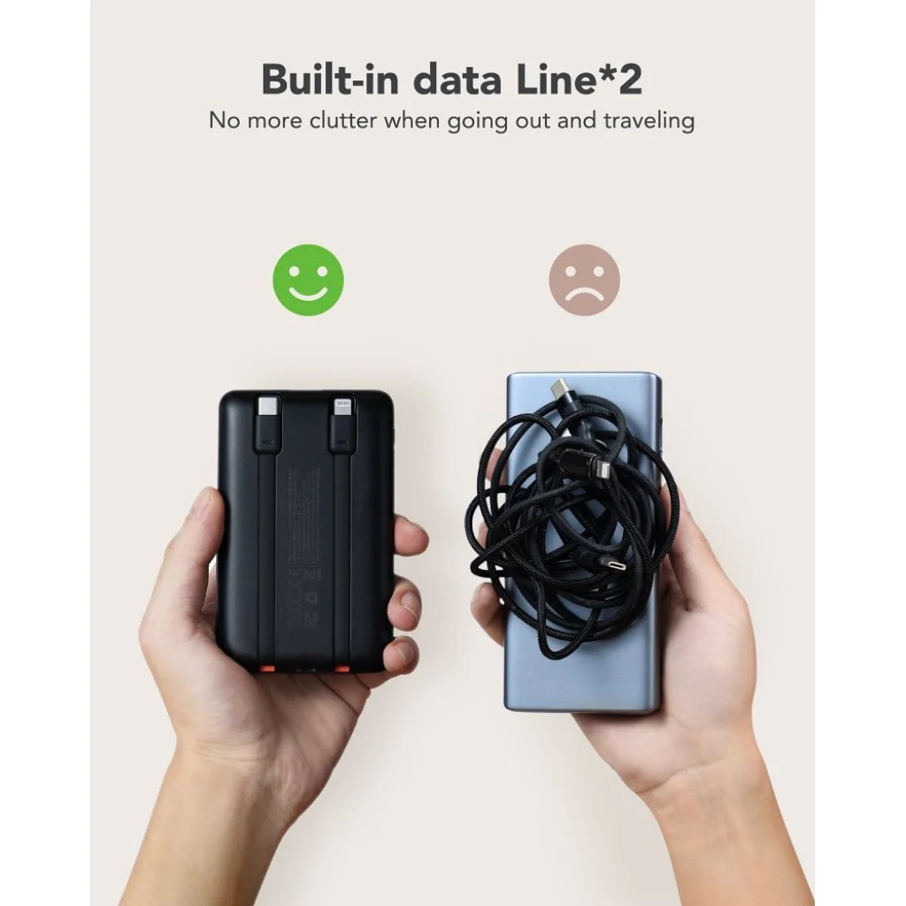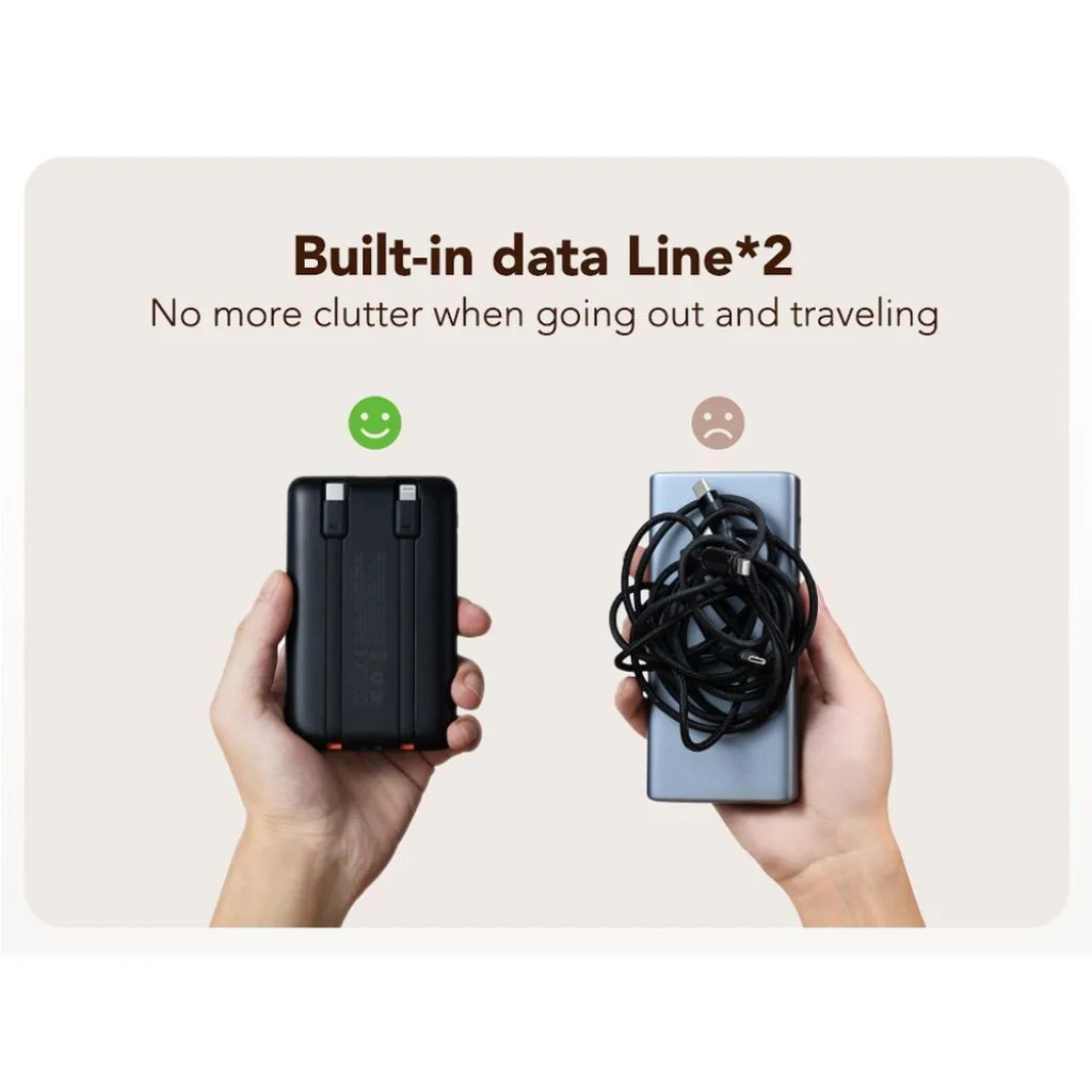 A Veger C11 különlegessége a beépített kábelekben rejlik: egy USB-C (18W/20W bemenet/kimenet) és egy Lightning (20W kimenet) kábellel érkezik, így nincs többé szükség extra kábelek cipelésére. Egyszerűen csatlakoztassa készülékét közvetlenül a power bankhoz, és élvezze a rendszerezett, gyors töltést út közben is. A beépített kábelek mellett egy USB-A (22.5W) kimeneti port, valamint USB-C (18W) és Lightning (18W) bemeneti portok is rendelkezésre állnak, garantálva a széleskörű kompatibilitást a piacon lévő legtöbb modern eszközzel.