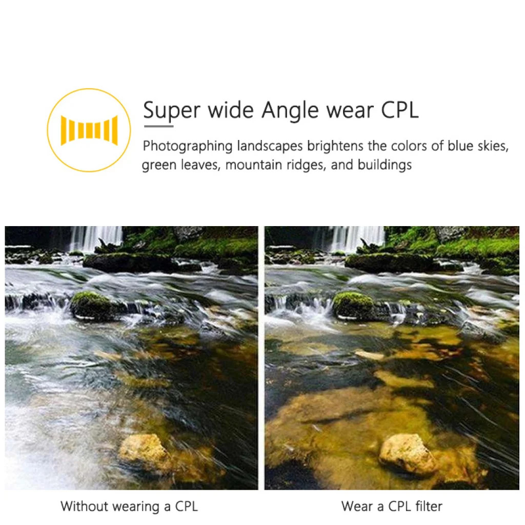 A képeken látható módon, a CPL szűrő használatával a víz alatti részletek tisztábban látszanak, és a tájképek fotózása során élénkebbé teszi a kék égbolt, a zöld lombok, a hegygerincek és az épületek színeit. Ezáltal a felvételek sokkal kontrasztosabbak és telítettebbek lesznek, élethűbb vizuális élményt nyújtva.