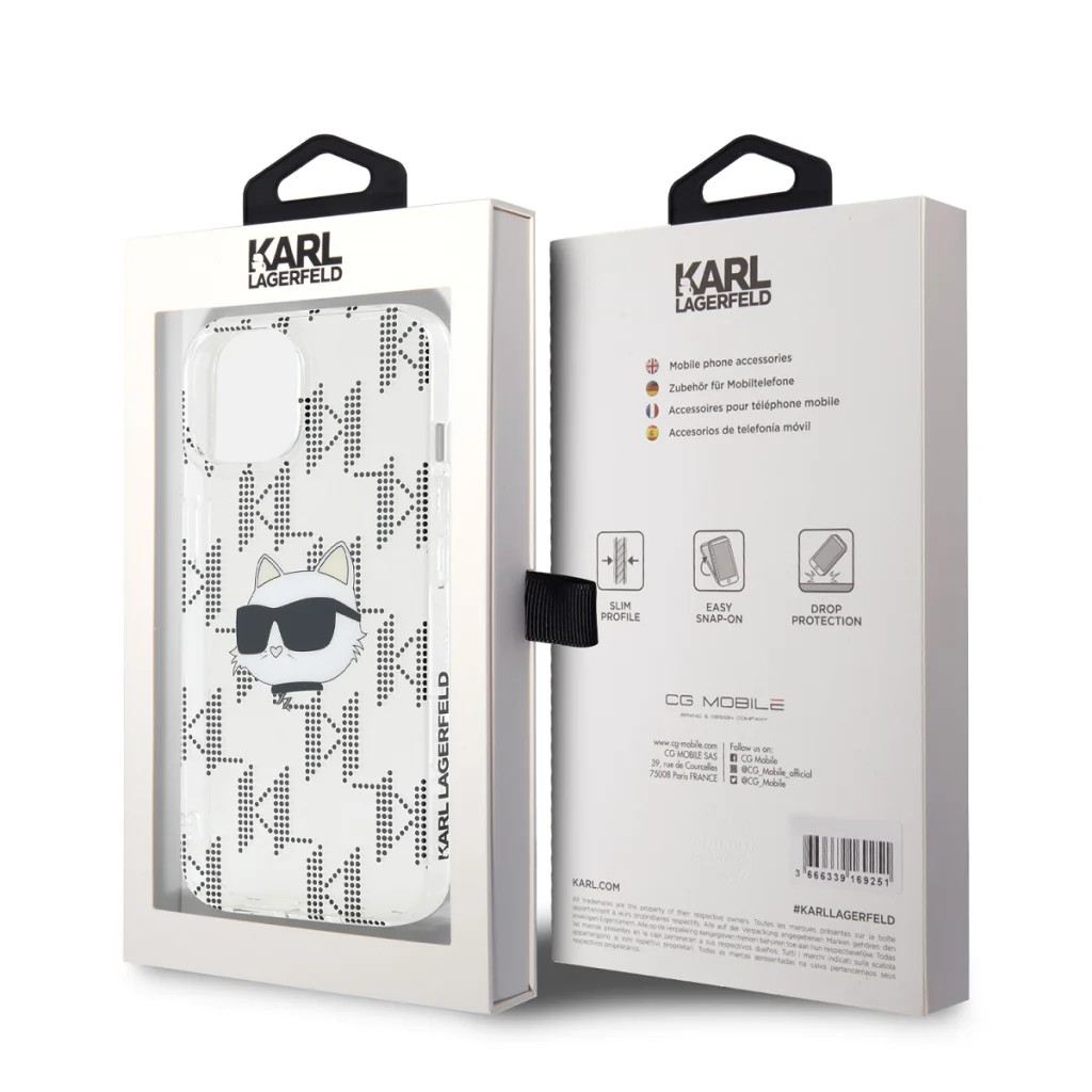 Az ikonikus Karl Lagerfeld design, melyet a bájos Choupette fej és a klasszikus KL monogram díszít, azonnal magára vonzza a tekinteteket. Az IML (In-Mould Labeling) technológiának és az elektroplatozott részleteknek köszönhetően a minta tartós és fényes marad, miközben a tok átlátszósága engedi érvényesülni az iPhone 15 eredeti színét és dizájnját.