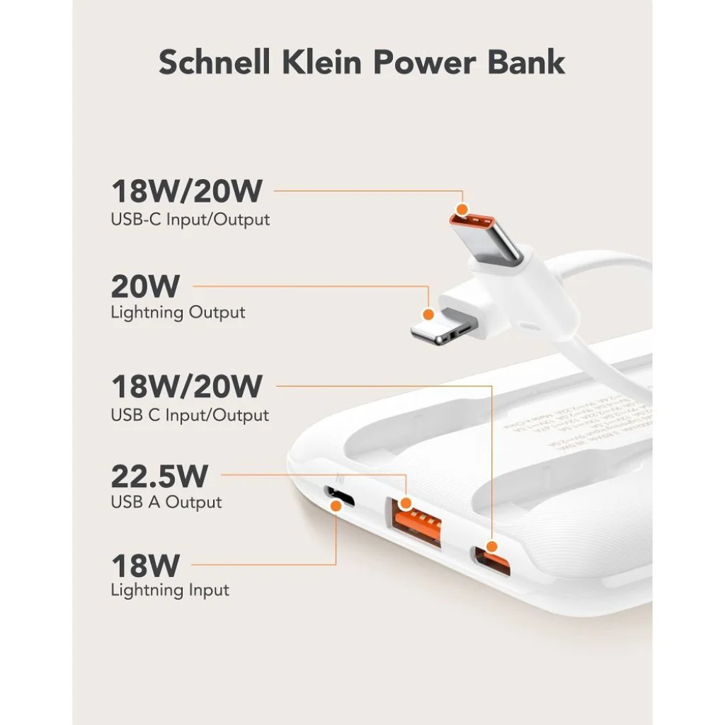 Felejtse el a kusza kábeleket és a különféle csatlakozók keresését! A VEGER C11C powerbank két beépített kábellel érkezik: egy USB-C (18W/20W bemenet/kimenet) és egy Lightning (20W kimenet) kábellel, amelyek közvetlenül kompatibilisek a piacon lévő legtöbb modern eszközzel. Ez a zseniális megoldás biztosítja, hogy mindig kéznél legyen a megfelelő kábel, akár Androidos, akár iOS eszközt tölt. Emellett a powerbank rendelkezik egy klasszikus USB-A (22,5W) kimeneti, valamint USB-C (18W) és Lightning (18W) bemeneti portokkal is, így további csatlakozási lehetőségeket kínál.