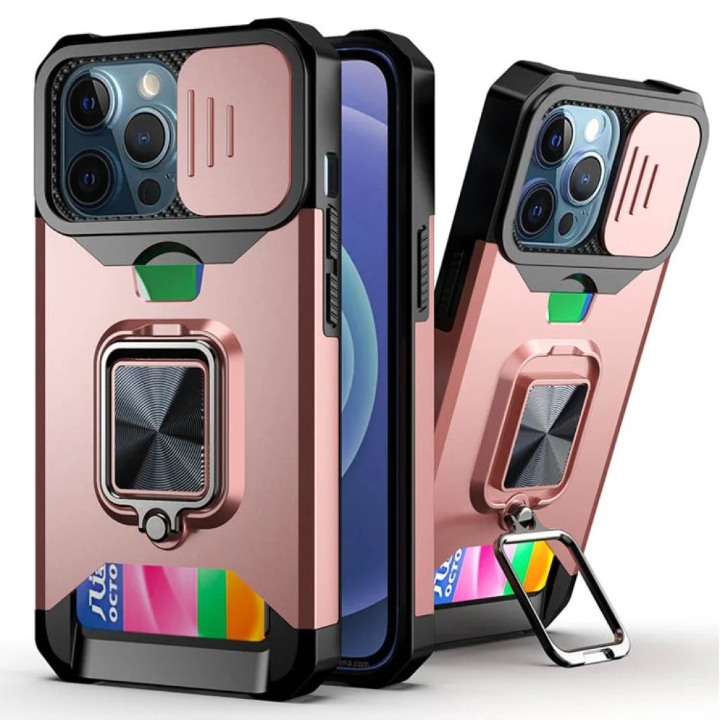 iPhone 13 Ring Armor tok kameralencse védővel, kihajtható támasszal, kártyatartóval rózsaszín (ip-13-ring-armor-pink)